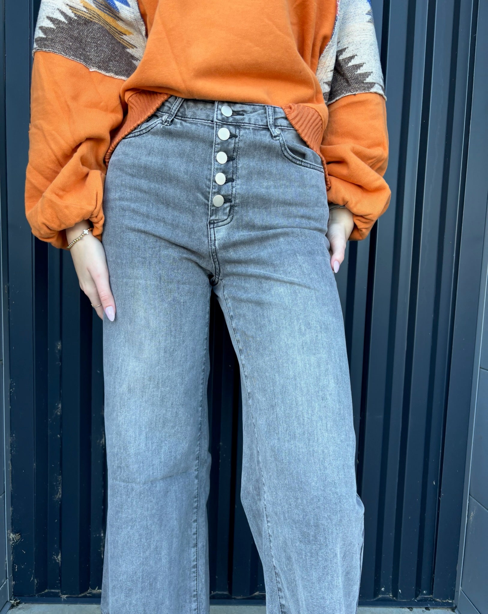 Front Button Stretch Twill Bell Bottom Pants